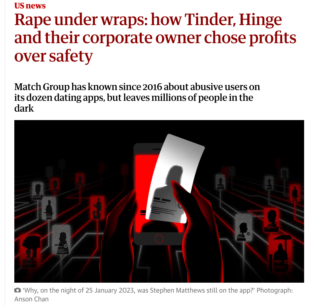 This morning, there was a horrific investigative article on accusations of rape/assault in the Match Group1. It’s a story of woman who went on a date with a cardiologist, Steven Matthews, who invited her back to his place, and offered her a drink. You can probably already tell where this is going: she began to lose control and he put her in a headlock. It ends relatively well, as far as these stories go: she was able to resist his attempts to pull her back inside, and vomited home in an Uber. She continued vomiting for hours, and when she pulled herself together, she reported the profile to Hinge, whose parent company is the Match Group.